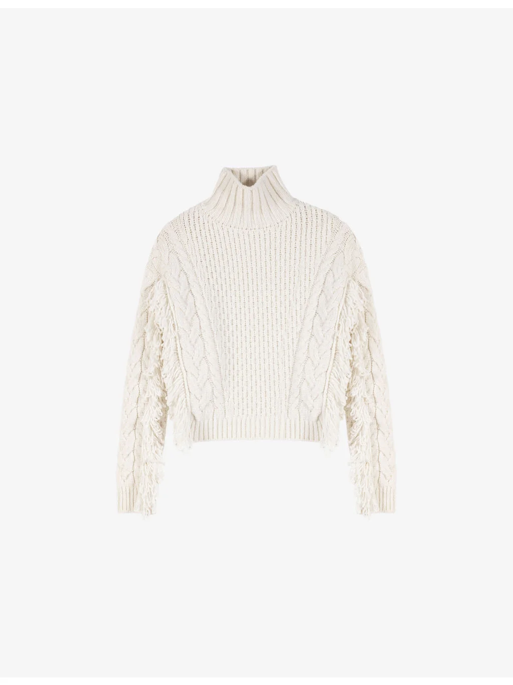 PRODUCT DETAILS - Maje wool-blend jumper - 49% wool, 48% acrylic, 3% elastane - Relaxed fit, high neck, long sleeves, fringed trims, ribbed finish - Hand wash - True to size - Model is 5ft 10in/1.78m and wears a size UK 8 - Midweight, slight stretch Ref: R04549683