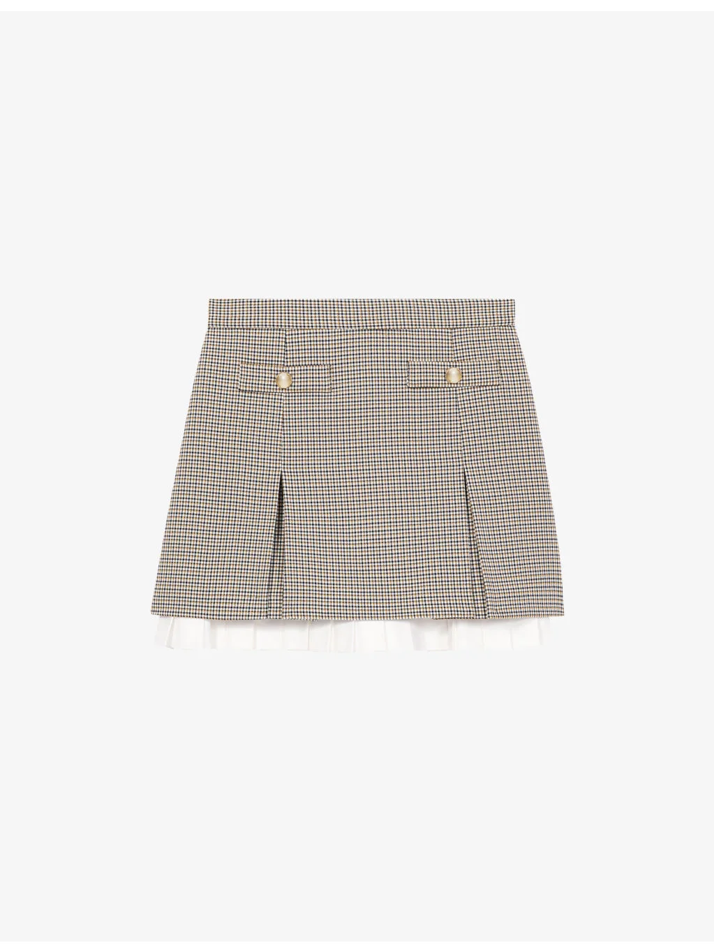 PRODUCT DETAILS - Maje stretch-woven mini skirt - 85% polyester, 10% viscose, 5% elastane - Regular fit, high rise, all-over houndstooth check, two mock buttoned pockets at front, pleated front, contrasting pleated poplin trim at hem - Dry clean only - True to size - Midweight, slight stretch Ref: R04598256