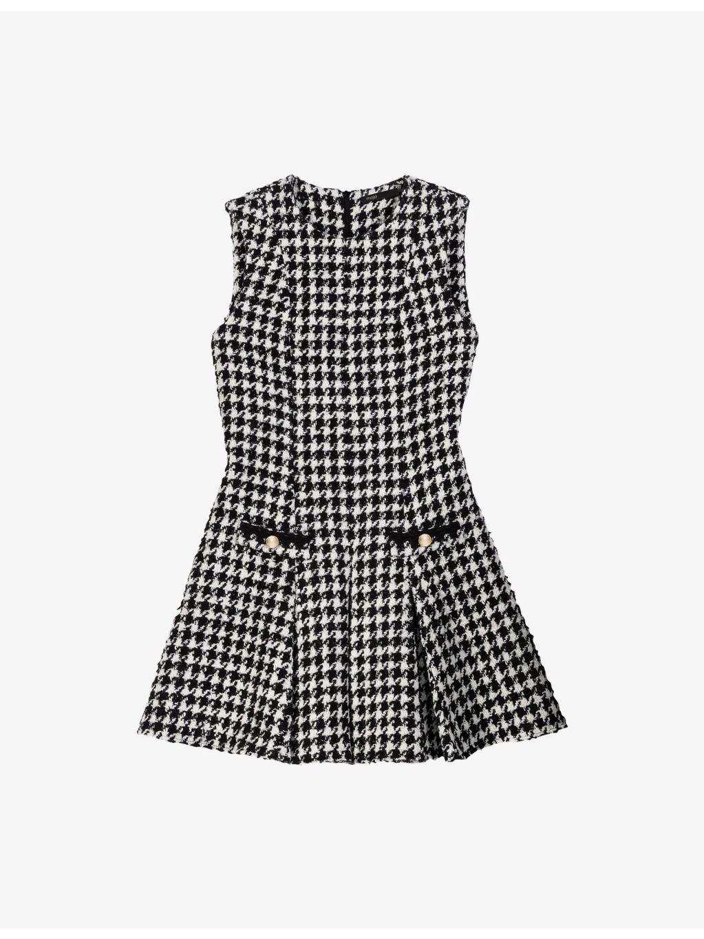 PRODUCT DETAILS - Maje tweed dress - 33% cotton, 25% acrylic, 24% polyester, 14% wool, 2% metalized fibers, 2% other fibres - Concealed zip fastening at back - Regular fit, round neck, sleeveless, two pockets at the side, all-over houndstooth design, gold-tone hardware, flared skirt - Dry clean - True to size - Model is 5ft 10in/1.78m and wears a size UK 8 - Midweight, non-stretch Ref: R04533898