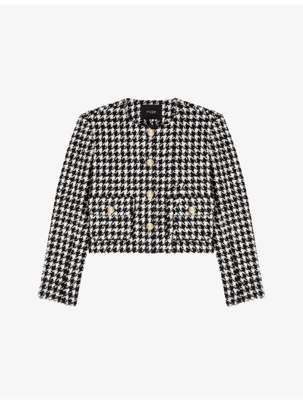 PRODUCT DETAILS - Maje tweed jacket - 33% cotton, 25% acrylic, 24% polyester, 14% wool, 2% metalized fibers, 2% other fibres - Exposed button fastening at front - Regular fit, round neck, long sleeves, two pockets at the side, all-over houndstooth design, gold-tone hardware - Dry clean - True to size - Model is 5ft 10in/1.78m and wears a size UK 8 - Midweight, non-stretch Ref: R04532900