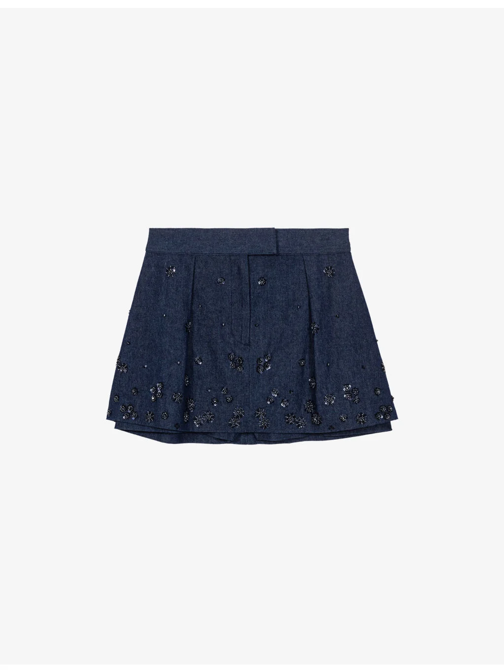 PRODUCT DETAILS - Maje denim shorts - 100% cotton - Concealed hook-and-eye and zip fastening at back - Regular fit, high rise, elasticated-back waist, all-over sequin embellishment, layered effect - Hand wash - True to size - Model is 5ft 10in/1.78m and wears a size UK 8 - Midweight, non-stretch Ref: R04598346