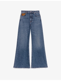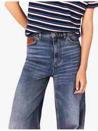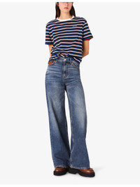 PRODUCT DETAILS - Maje stretch-denim jeans - 99% cotton, 1% elastane - Exposed button and concealed zip-fly fastening at front - Regular fit, high rise, belt loops, five pockets, leather coin pocket, wide leg, faded wash, whiskering, leather brand patch at back - Machine wash at 30°C - True to size - Model is 5ft 10in/1.78m and wears a size UK 8 - Midweight, slight stretch Ref: R04509754