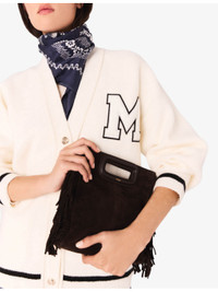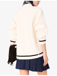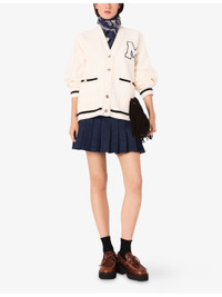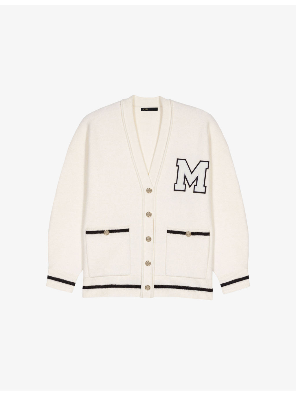 PRODUCT DETAILS - Maje stretch-knit cardigan - 56% polyester, 36% acrylic, 5% wool, 3% elastane - Exposed button fastening at front - Relaxed fit, V neck, logo embroidery at the chest, two pockets at the side, gold-tone hardware, contrast trim - Hand wash cold - True to size - Model is 5ft 10in/1.78m and wears a size UK 8 - Midweight, slight stretch Ref: R04514799