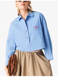 PRODUCT DETAILS - Maje woven shirt - 81% polyester, 19% cotton - Exposed button fastening at front - Boxy fit, collar, long sleeves, dropped shoulders, patch pocket, ‘Maje Yacht Club’ logo embroidery to pocket, buttoned cuffs, silver-toned metal buttons, pleated back, cropped - Machine wash cold - True to size - Model is 5ft 10in/1.78m and wears a size UK 8 - Lightweight, slight stretch Ref: R04598341