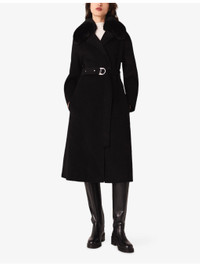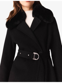PRODUCT DETAILS - Maje wool-blend coat - 80% wool, 20% polyamide - Adjustable buckle fastening - Regular fit, removable faux-fur collar, long sleeves, belted at the waist, silver-tone hardware, long length - Dry clean - True to size - Model is 5ft 9in/1.75m and wears a size UK 8 - Midweight, non-stretch Ref: R04522379