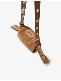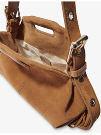 PRODUCT DETAILS - Maje suede shoulder bag - 100% suede - Magnetic fastening - Adjustable shoulder strap, eyelet embellishment, logo embossed at the front, fringed trims, one main compartment, silver-tone hardware - Height 13cm, width 22cm, depth 11cm - Specialist leather clean Ref: R04411087