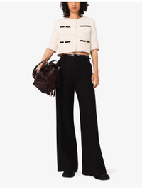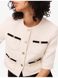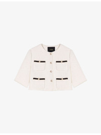 PRODUCT DETAILS - Maje tweed jacket - 60% cotton, 20% polyester, 14% acrylic, 3% polyamide, 2% viscose, 1% metalized fibers - Exposed button fastening at front - Regular fit, round neck, contrast trim, four patch pockets at the side, gold-tone hardware - Hand wash - True to size - Model is 5ft 9in/1.75m and wears a size UK 8 - Midweight, slight stretch Ref: R04495417