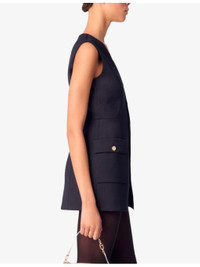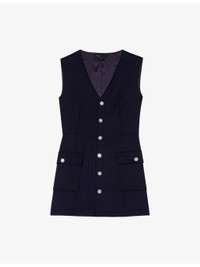 PRODUCT DETAILS - Maje woven mini dress - 54% polyester, 44% virgin wool, 2% elastane - Button fastening at front - V-neck, sleeveless, two patch pockets at front, lined - Dry clean - True to size - Midweight, non-stretch Ref: R04411511