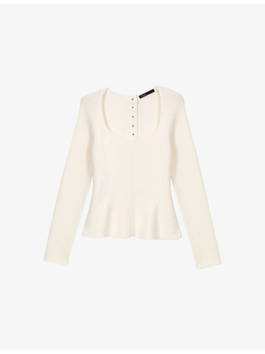 PRODUCT DETAILS - Maje stretch-knit jumper - 48% polyamide, 26% wool, 11% acrylic, 9% elastane, 6% polyester - Slim fit, square neck, long sleeves, peplum hem - Hand wash - True to size - Model is 5ft 9in/1.75m and wears a size UK 8 - Midweight, slight-stretch Ref: R04532858