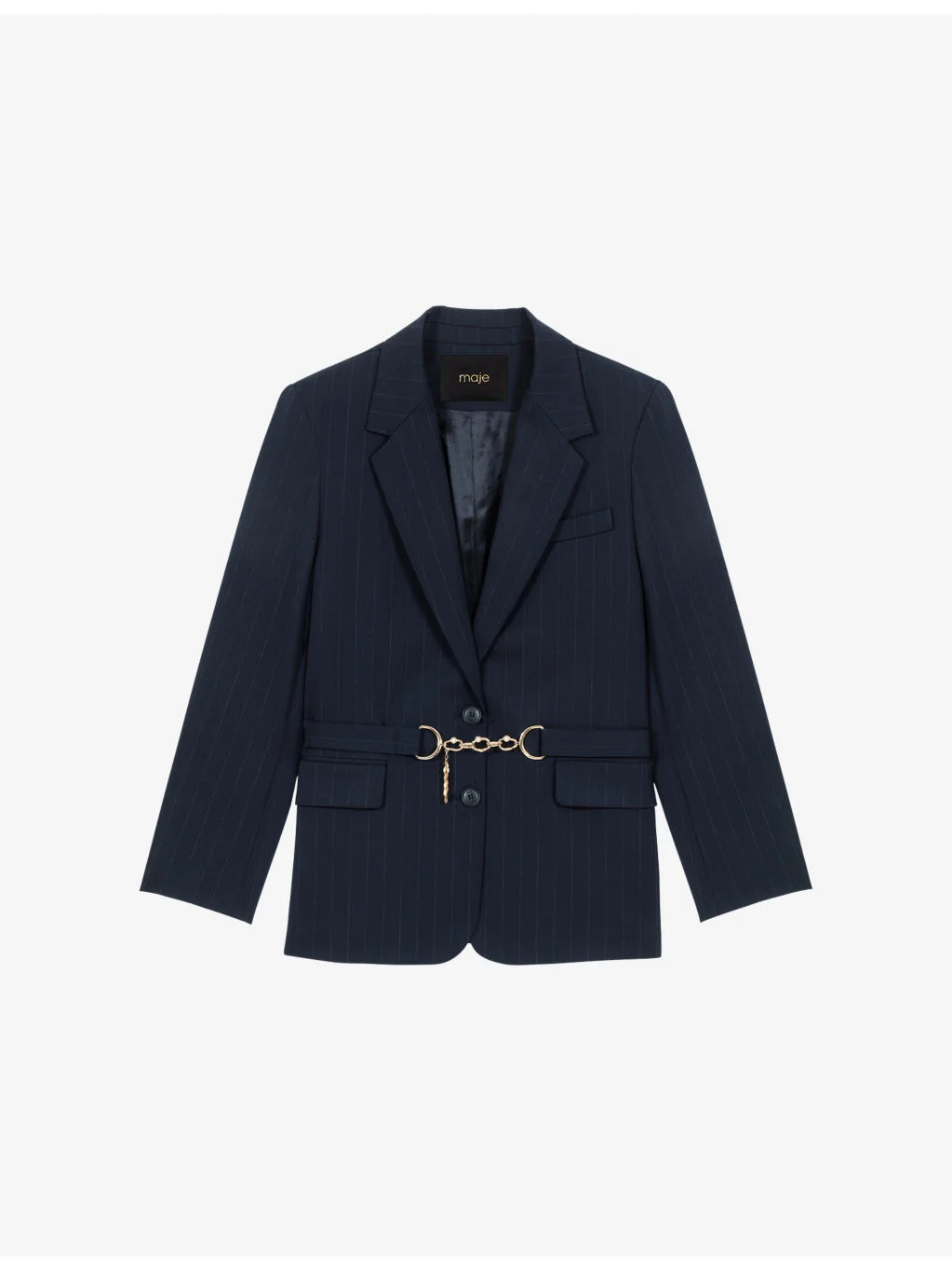 PRODUCT DETAILS - Maje wool-blend blazer - 54% wool, 41% polyester, 5% elastane; lining 100% viscose - Exposed button fastenings at front - Regular fit, single-breasted, notch lapels, padded shoulders, long sleeves, buttoned cuffs, removable gold-toned chain belt with charm at waist, one chest welt pocket, two front flap pockets, brand jacquard lining, all-over pinstripe pattern - Specialist dry clean - True to size - Lightweight, non-stretch Ref: R04597428