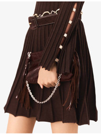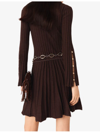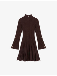 PRODUCT DETAILS - Maje stretch-knit dress - 32% polyester 31% polyamide 18% acrylic 16% wool 3% elastane - Hook-and-eye fastening - Slim fit, high neck, long sleeves, pleated flared skirt, clover buckle embellishment - Hand wash - True to size - Model is 5ft 11in/1.80m and wears a size UK 8 - Midweight, non-stretch Ref: R04532831