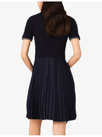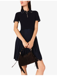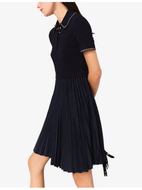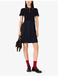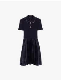 PRODUCT DETAILS - Maje stretch-woven mini dress - 56% viscose, 43% polyamide, 1% elastane; skirt 71% polyester, 29% elastomultiester - Exposed button fastening at front - Slim fit, polo collar, short sleeves, gold-toned buttons, contrasting striped trim to collar and cuffs, all-over ribbed top, contrasting pleated skirt, mini length - Hand wash - True to size - Model is 5ft 10in/1.78m and wears a size UK 8 - Lightweight, slight stretch Ref: R04510242