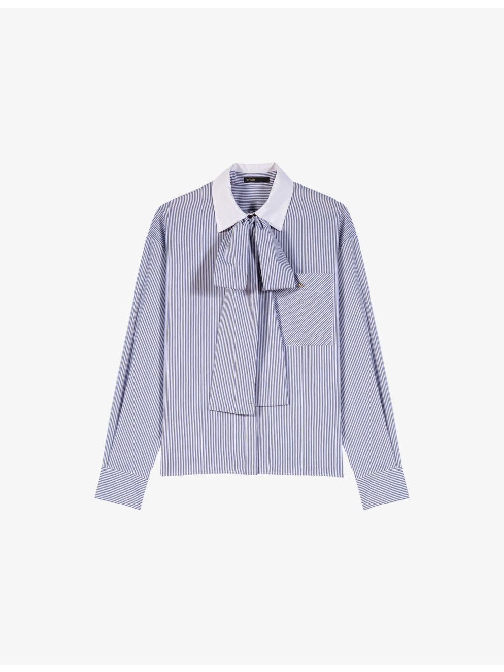 PRODUCT DETAILS - Maje cotton shirt - 86% cotton, 14% polyamide - Exposed button fastening at front - Relaxed fit, pussy bow collar, long sleeves, all-over stripe pattern - Dry clean - True to size - Model is 5ft 10in/1.78m and wears a size UK 8 - Lightweight, non-stretch Ref: R04529206