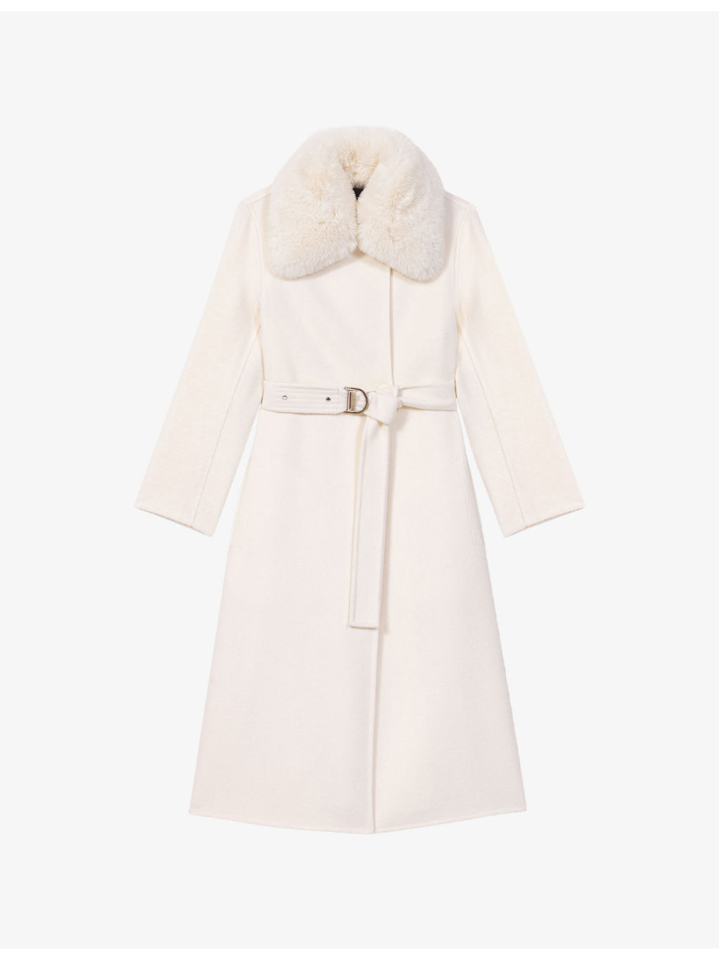 PRODUCT DETAILS - Maje wool-blend coat - 81% wool, 19% polyamide - Exposed button fastening at front - Regular fit, removable faux-fur collar, long sleeves, belted at the waist, gold-tone hardware, long length - Dry clean - True to size - Model is 5ft 9in/1.75m and wears a size UK 8 - Midweight, non-stretch Ref: R04533229