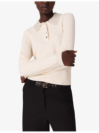 PRODUCT DETAILS - Maje stretch wool-blend polo - 88% wool, 10% polyamide, 2% elastane - Exposed button fastening at front - Slim fit, rhinestone-embellished collar, long sleeves, cable-knit texture - Hand wash - True to size - Model is 5ft 10in/1.78m and wears a size UK 8 - Midweight, slight-stretch Ref: R04532848
