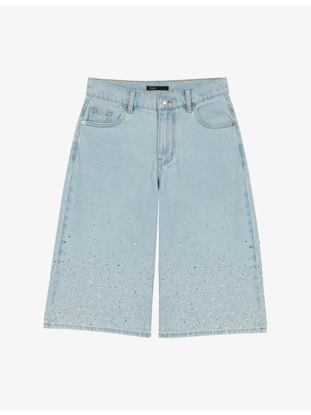 PRODUCT DETAILS - Maje denim Bermuda shorts - 99% cotton, 1% elastane - Button and zip-fly fastening - Regular fit, mid-rise, straight leg, belt loops, side pockets, back pockets, rhinestone embellishment to hems, faded wash - Machine wash mild - True to size - Model is 5ft 9in/1.75m and wears a size UK 8 - Midweight, non-stretch Ref: R04606200