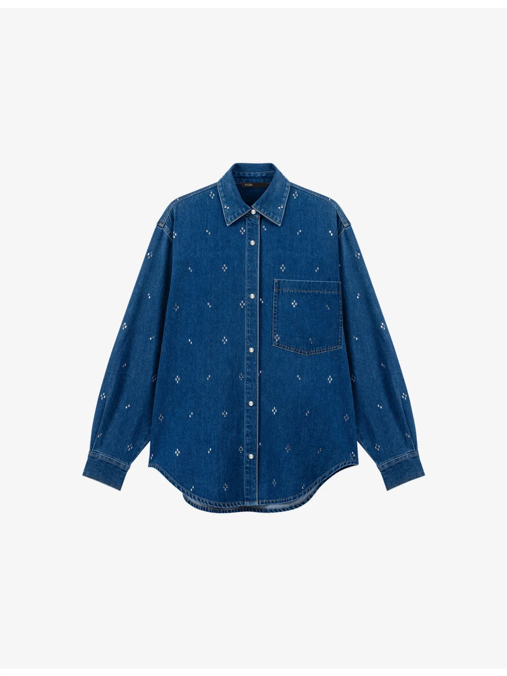 PRODUCT DETAILS - Maje denim shirt - 100% cotton - Button fastening - Oversized fit, classic collar, long sleeves, all-over silver rhinestones in geometric patterns, chest patch pockets, rounded hem - Machine wash mild - True to size - Midweight, non-stretch Ref: R04597446
