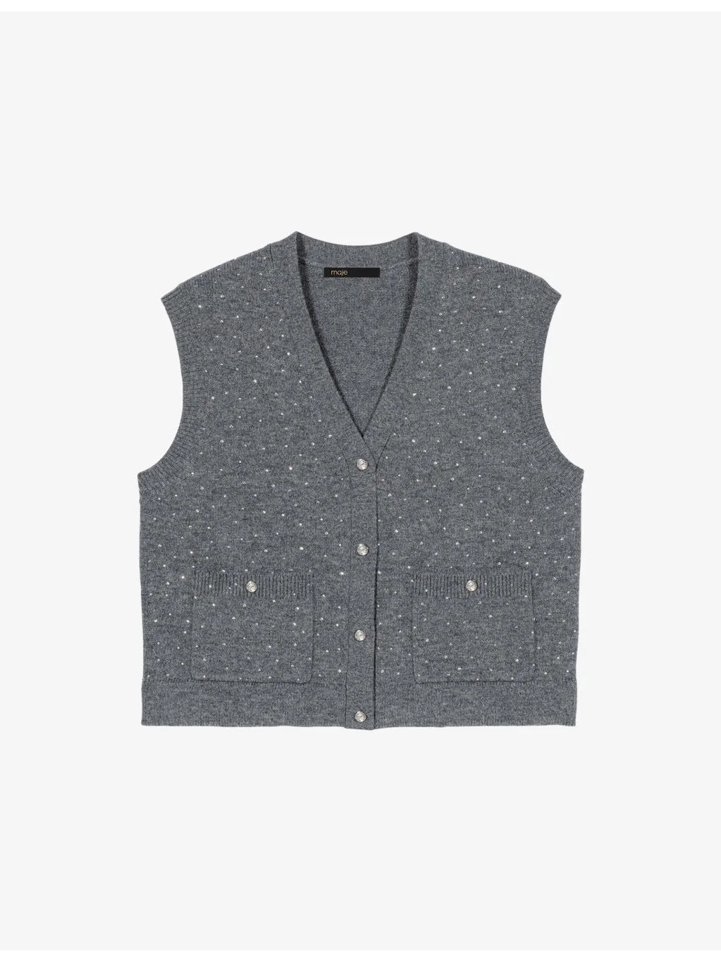 PRODUCT DETAILS - Maje wool vest top - 94% wool, 5% polyamide, 1% elastane - Button fastening - V-neck, sleeveless, ribbed knit, all-over rhinestone embellishment - Hand wash - True to size - Model is 5ft 9in/1.75m and wears a size UK 8 - Lightweight, stretchy Ref: R04597451