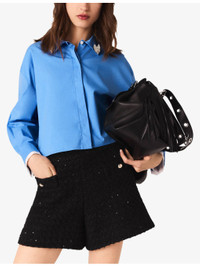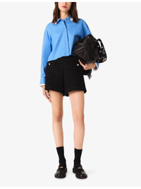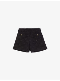 PRODUCT DETAILS - Maje tweed shorts - 47% cotton, 44% polyester, 6% acrylic, 3% wool - Concealed fastening - Regular fit, mid-rise, two pockets at the side, all-over rhinestone embellishment - Dry clean - True to size - Model is 5ft 9in/1.75m and wears a size UK 8 - Midweight, non stretch Ref: R04529207