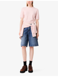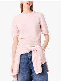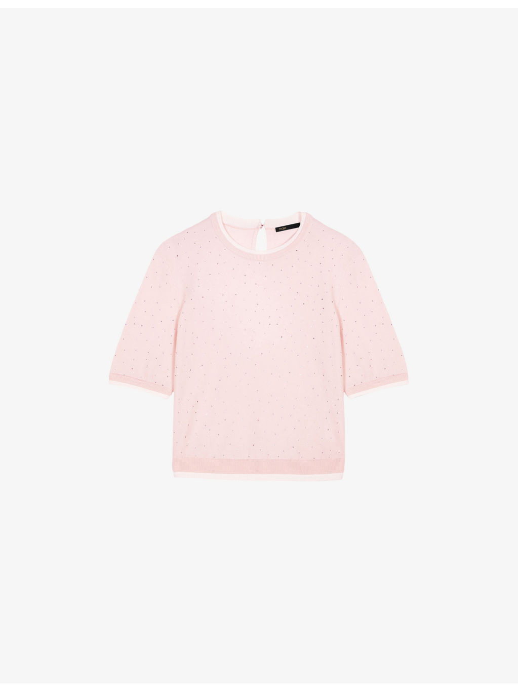 PRODUCT DETAILS - Maje stretch wool-blend jumper - 84% wool, 14% polyamide, 2% elastane - Hook-and-eye fastening - Regular fit, round neck, short sleeves, all-over rhinestone embellishments, keyhole back, contrasting layered-effect trim to collar, cuffs and hem, ribbed trims to collar, cuffs and hem - Hand wash - True to size - Model is 5ft 10in/1.78m and wears a size UK 8 - Lightweight, slight stretch Ref: R04495396