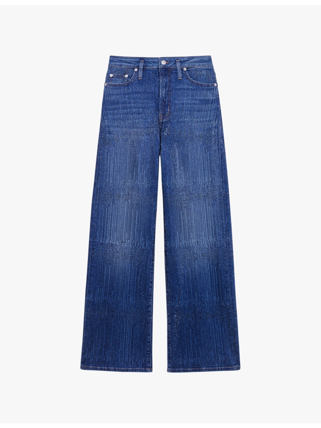PRODUCT DETAILS - Maje denim jeans - 81% cotton, 16% polyester, 2% lyocell, 1% elastane - Exposed button and concealed zip-fly fastening at front - Regular fit, high-rise, wide leg, structured waistband with belt loops, five pockets, contrast stitching, branded silver-toned hardware, all-over rhinestone embellishments with stripes, mid wash - Machine wash at 30°C - True to size - Model is 5ft 9in/1.75m and wears a size UK 6 - Midweight, non-stretch Ref: R04320780