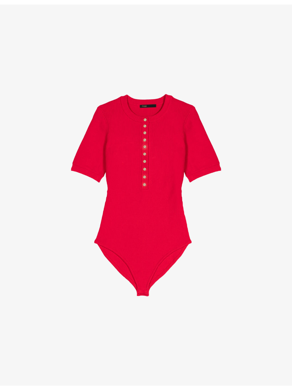 PRODUCT DETAILS - Maje stretch cotton-blend bodysuit - 80% cotton, 19% polyamide, 1% elastane - Exposed popper fastenings at front - Slim fit, round neck, short sleeves, all-over ribbed knit, gold-toned buttons - Hand wash - True to size - Model is 5ft 10in/1.78m and wears a size UK 8 - Lightweight, slight stretch Ref: R04509744