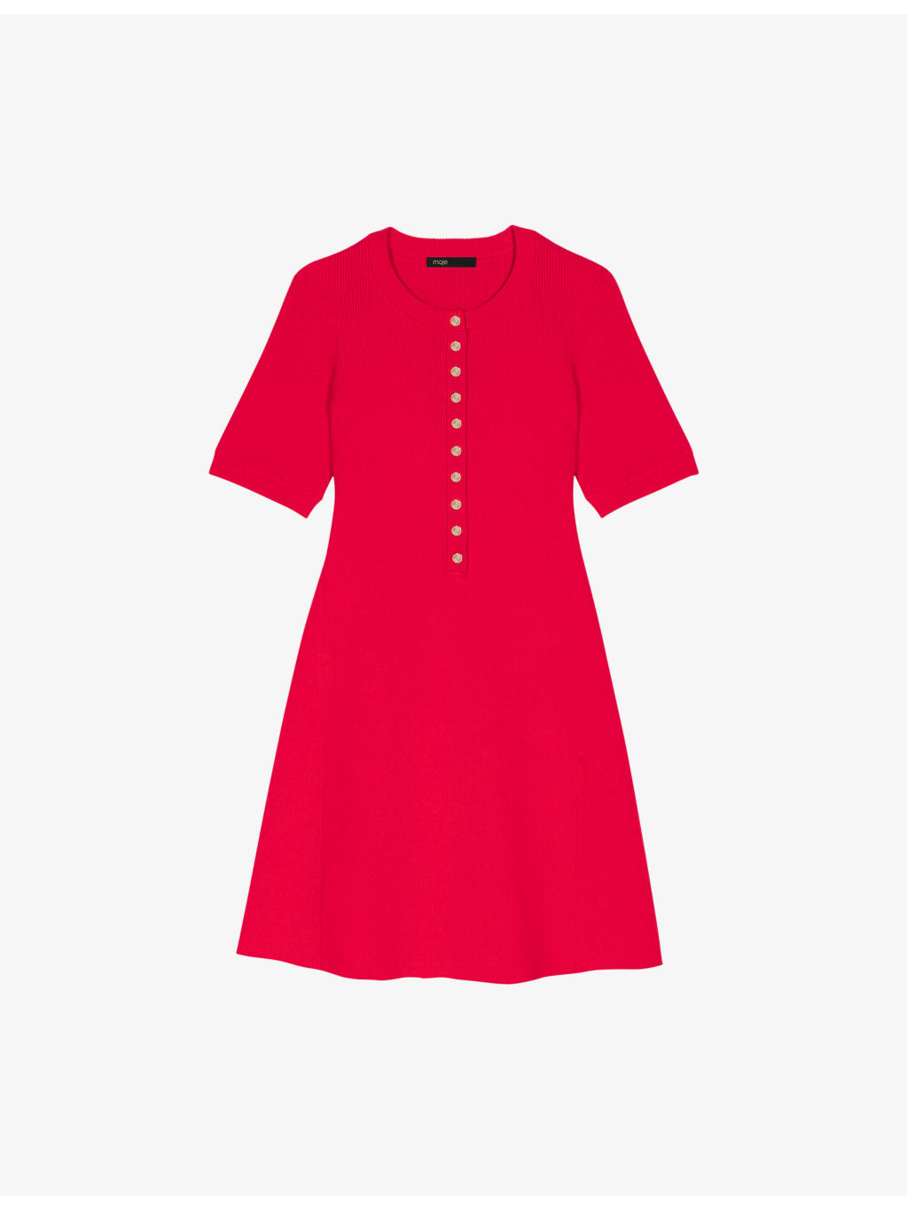 PRODUCT DETAILS - Maje stretch cotton-blend mini dress - 80% cotton, 19% polyamide, 1% elastane - Exposed popper fastenings at front - Slim fit, round neck, short sleeves, all-over ribbed knit, gold-toned buttons, mini length - Hand wash - True to size - Model is 5ft 10in/1.78m and wears a size UK 8 - Lightweight, slight stretch Ref: R04509745