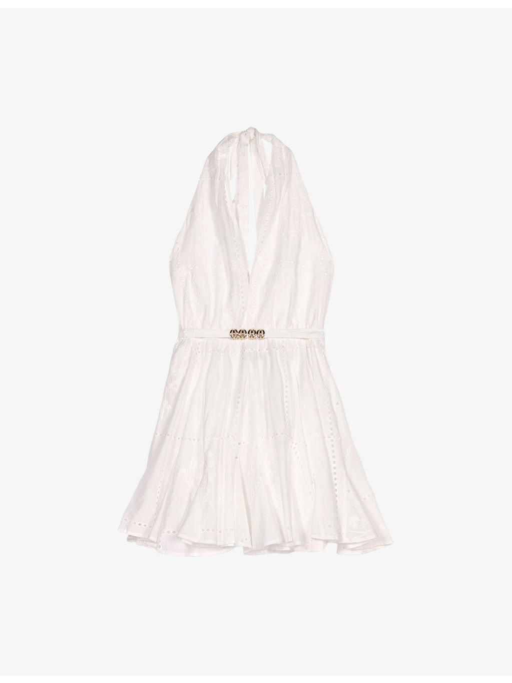 Ring-Embellished Halter-Neck Embroidered Cotton Mini Dress