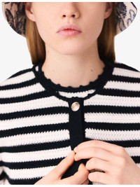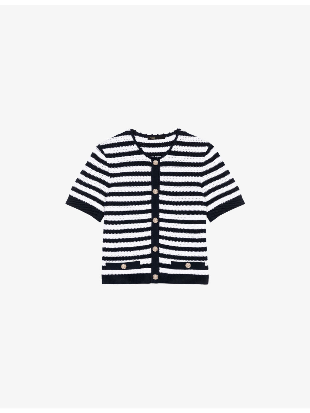 PRODUCT DETAILS - Maje crochet cardigan - 70% viscose, 30% polyester - Exposed button fastening at front - Regular fit, round neck, short sleeves, all-over stripe pattern, gold-tone hardware - Hand wash - True to size - Model is 5ft 9in/1.75m and wears a size UK 8 - Midweight, non-stretch Ref: R04491723