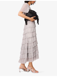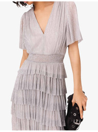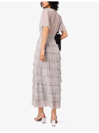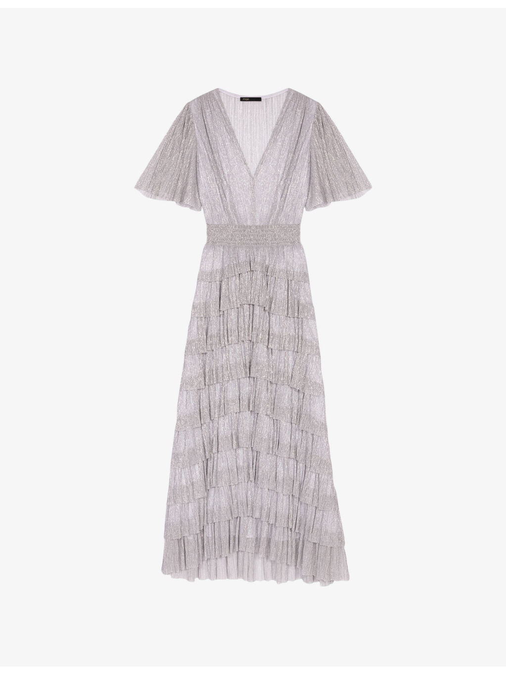 PRODUCT DETAILS - Maje metallic-woven maxi dress - 57% polyester, 43% metalised fibres; lining 100% viscose - Regular fit, V-neck, short sleeves, all-over metallic weave, smocked panel at waist, tiered ruffles from waist to hem, maxi length - Specialist dry clean only - True to size - Model is 5ft 9in/1.75m and wears a size UK 8 - Lightweight, non-stretch Ref: R04509778