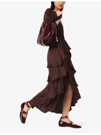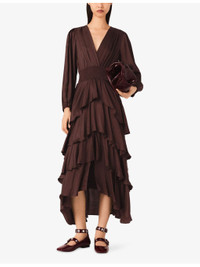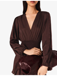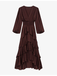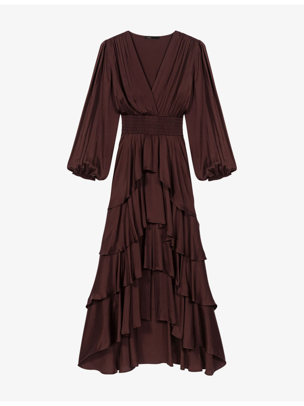 PRODUCT DETAILS - Maje woven dress - 100% viscose - Regular fit, V-neck, long sleeves, shirred waist, ruffled trim - Hand wash - True to size - Model is 5ft 11in/1.80m and wears a size UK 8 - Lightweight, non-stretch Ref: R04532855