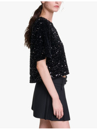 PRODUCT DETAILS - Maje velvet top - 100% polyester - Slips on - Relaxed fit, round neck, short sleeves, all-over sequin embellishment - Hand wash - True to size - Model is 5ft 9in/1.75m and wears a size UK 8 - Midweight, non-stretch Ref: R04341916