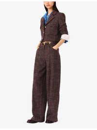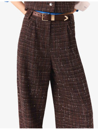 PRODUCT DETAILS - Maje tweed trousers - 49% cotton, 21% acrylic, 15% polyester, 12% polyamide, 2% viscose, 1% metalised fibres - Button and zip-fly fastening - Relaxed fit, high rise, belt loops, two pockets at the side, all-over sequin tweed embellishment, wide leg - Dry clean - True to size - Model is 5ft 11in/1.80m and wears a size UK 8 - Midweight, non-stretch Ref: R04532890