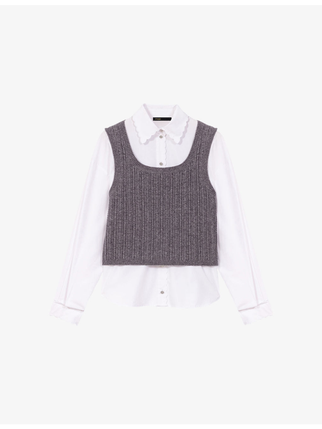 PRODUCT DETAILS - Maje stretch-knit top - 100% cotton; contrast 94% wool, 5% polyamide, 1% elastane - Exposed button fastening at front - Regular fit, removable shirt with collar, long sleeves, embroidered scalloped trim to collar, placket and cuffs, buttoned cuffs, knitted top with square neck, sleeveless, all-over ribbed - Hand wash - True to size - Model is 5ft 11in/1.80m and wears a size UK 8 - Midweight, slight stretch Ref: R04522376