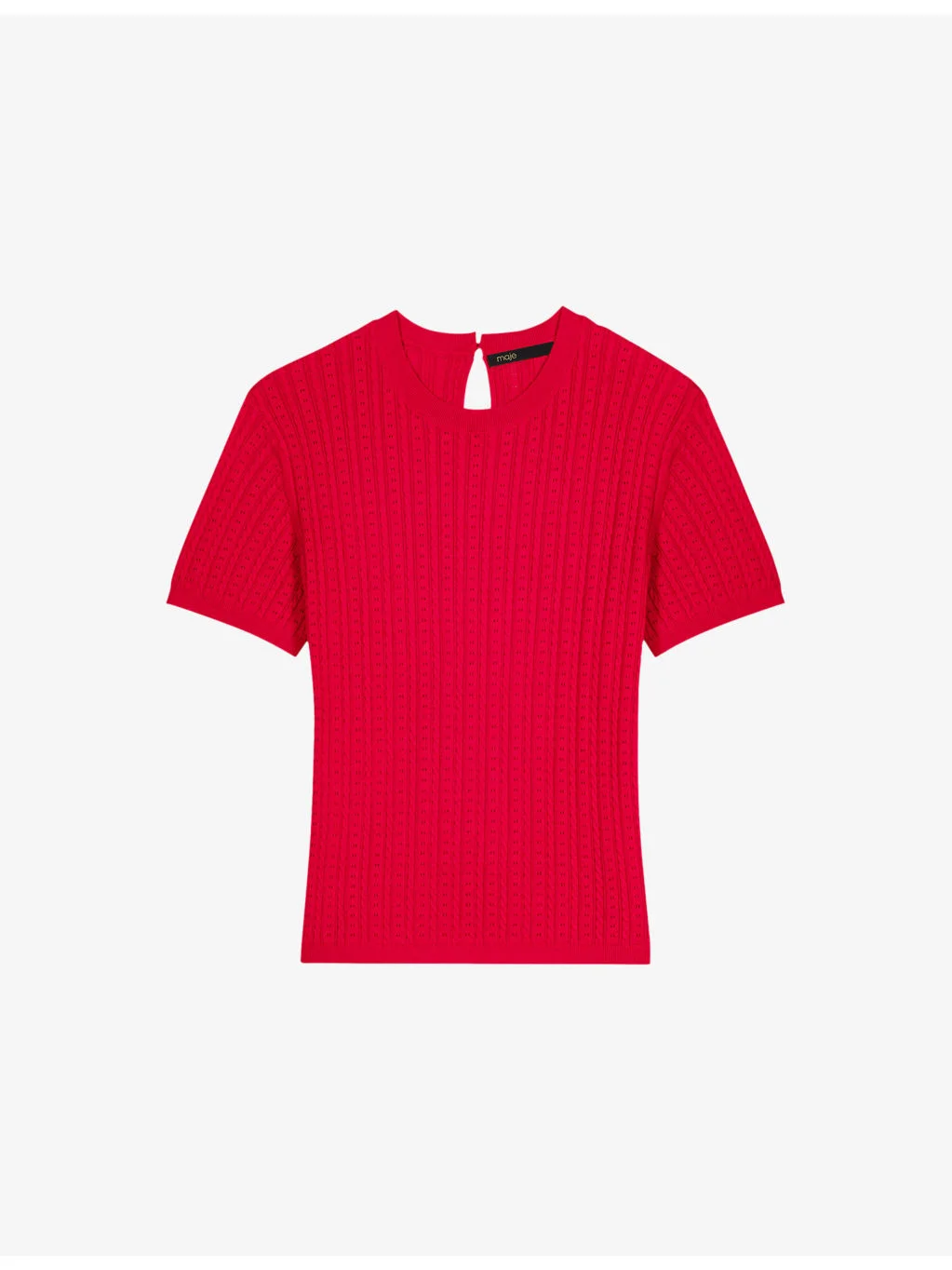 PRODUCT DETAILS - Maje cotton-blend jumper - 68% cotton, 21% polyamide, 11% silk - Regular fit, round-neck, short sleeves, cable-knit and pointelle texture, ribbed trims - Hand wash - True to size - Model is 5ft 9in/1.75m and wears a size UK 8 - Lightweight, slight stretch Ref: R04606252