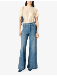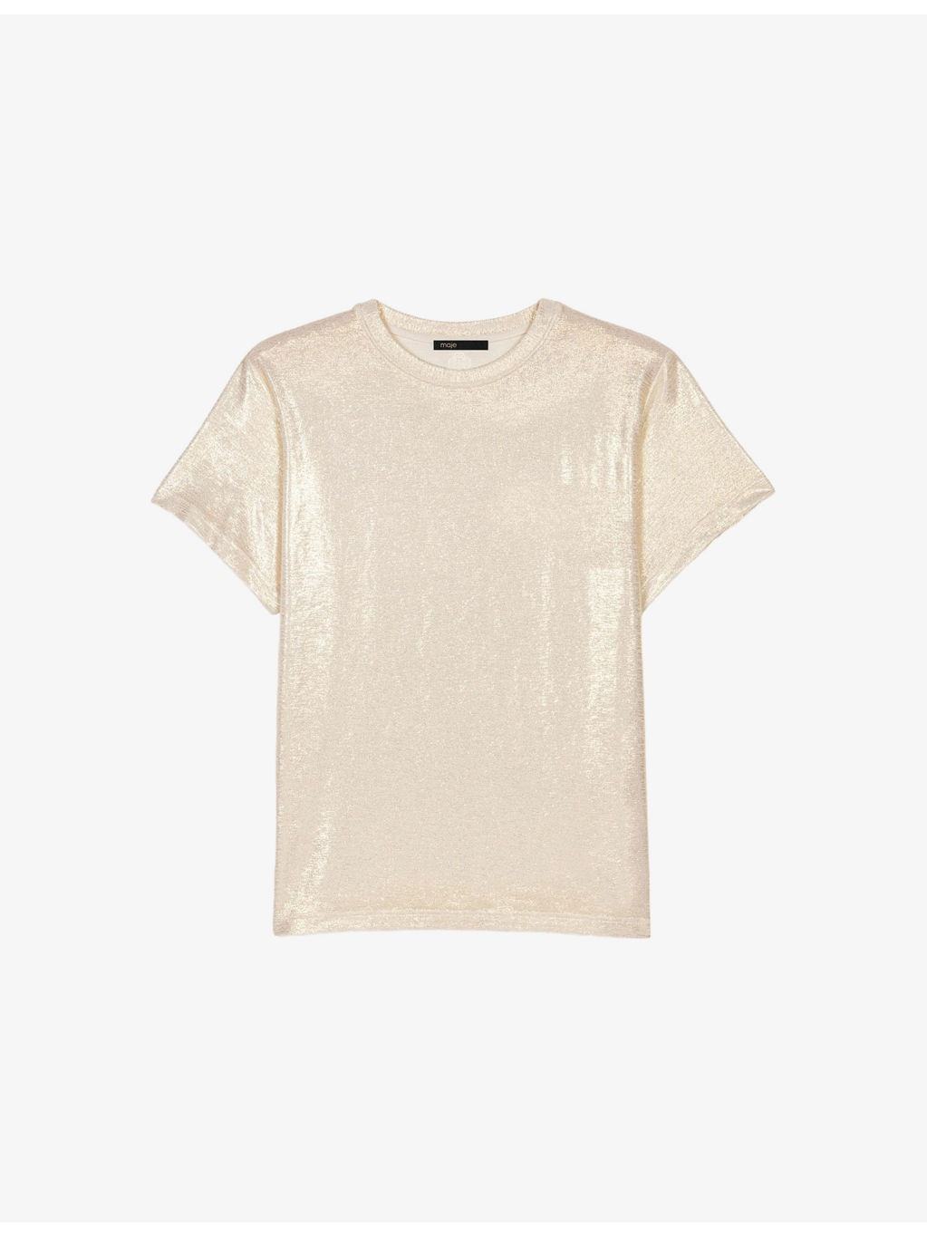 PRODUCT DETAILS - Maje stretch-jersey T-shirt - 95% polyester, 5% elastane - Slips on - Regular fit, round neck, short sleeves, metallic finish - Hand wash - True to size - Model is 5ft 10in/1.78m and wears a size UK 8 - Lightweight, slight stretch Ref: R04411341