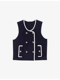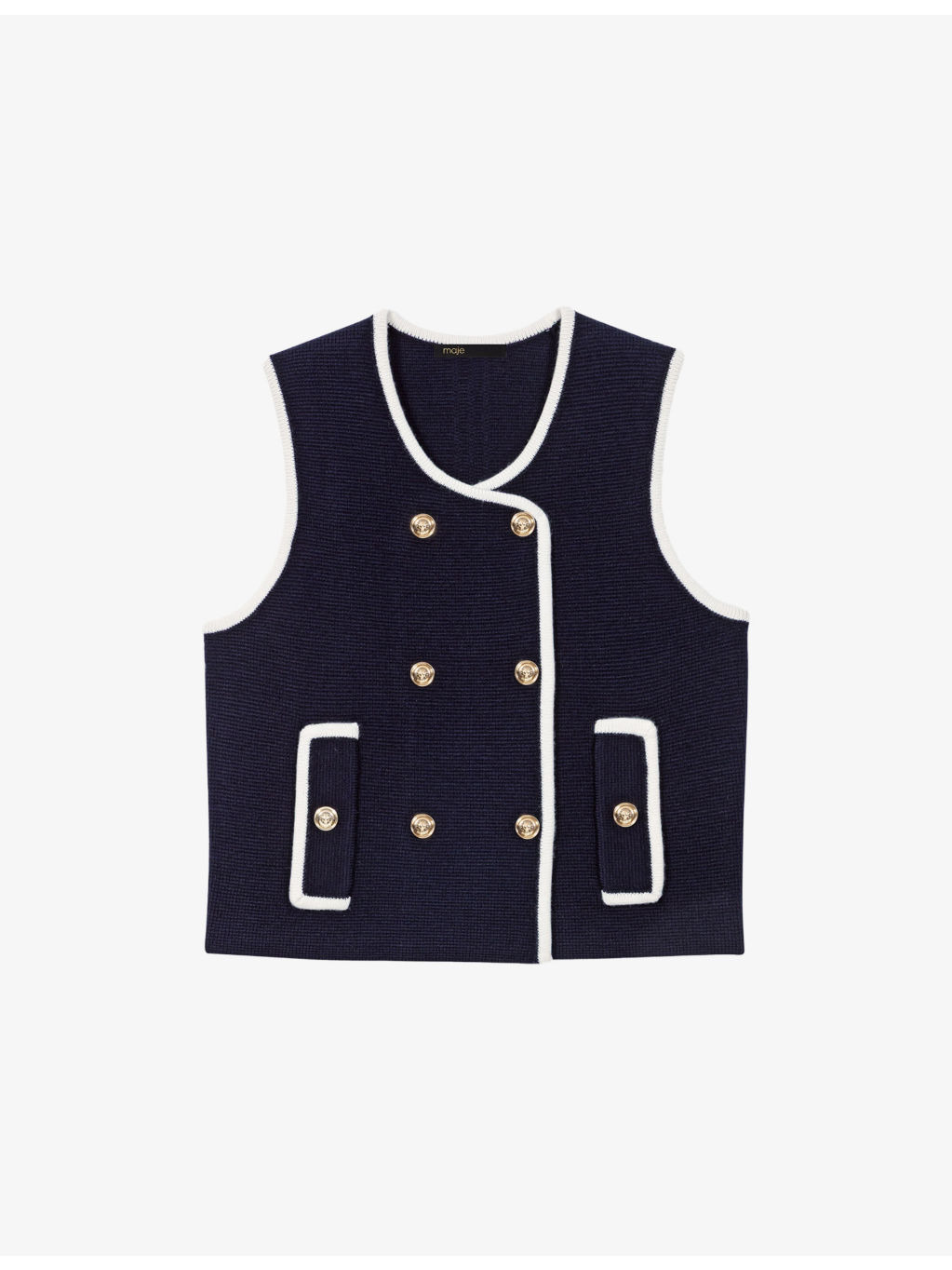 PRODUCT DETAILS - Maje wool-blend top - 42% acrylic, 40% wool, 18% polyamide - Exposed button fastening at front - Regular fit, round neck, sleeveless, contrast trims, gold-tone buttons, double-breasted - Hand wash - True to size - Model is 5ft 10in/1.78m and wears a size UK 8 - Midweight, non-stretch Ref: R04532850