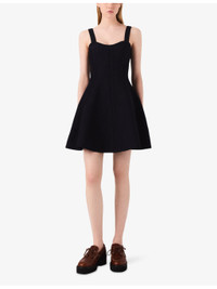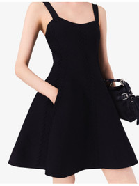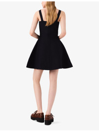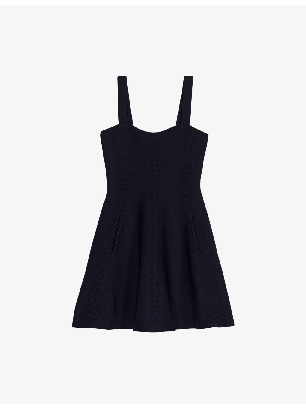 PRODUCT DETAILS - Maje knitted dress - 100% polyester - Concealed fastening - Regular fit, square neck, wide straps, sleeveless, embroidered detailing, fitted waist, flared skirt - Hand wash - True to size - Model is 5ft 10in/1.78m and wears a size UK 8 - Midweight, non-stretch Ref: R04491716