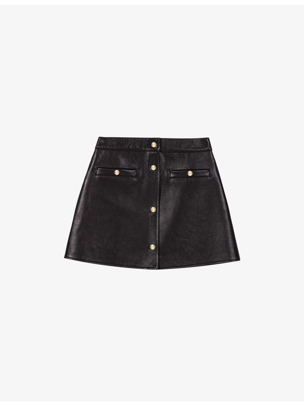 PRODUCT DETAILS - Maje leather skirt - 100% lambskin leather - Concealed zip fastening at back - Straight cut, high rise, decorative gold-tone buttons, two patch pockets at the front - Specialist leather clean - True to size - Model is 5ft 9in/1.75m and wears a size UK 8 - Midweight, non-stretch Ref: R04532845