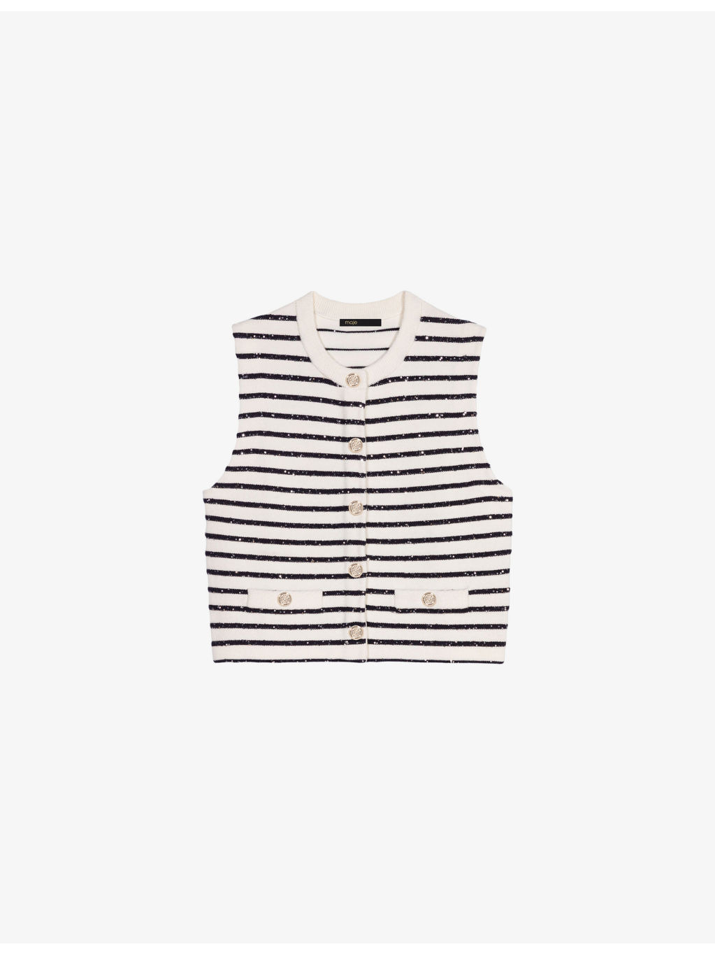 PRODUCT DETAILS - Maje knitted cardigan - 36% acrylic, 33% wool, 12% polyamide, 10% polyester, 7% viscose, 1% elastane, 1% metalised fibres - Pressed stud fastening - Regular fit, round neck, sleeveless, all-over striped pattern, rhinestone-embellished stripes, two buttoned welt pockets at front - Hand wash - True to size - Model is 5ft 10in/1.78m and wears a size UK 8 - Midweight, slight stretch Ref: R04495397
