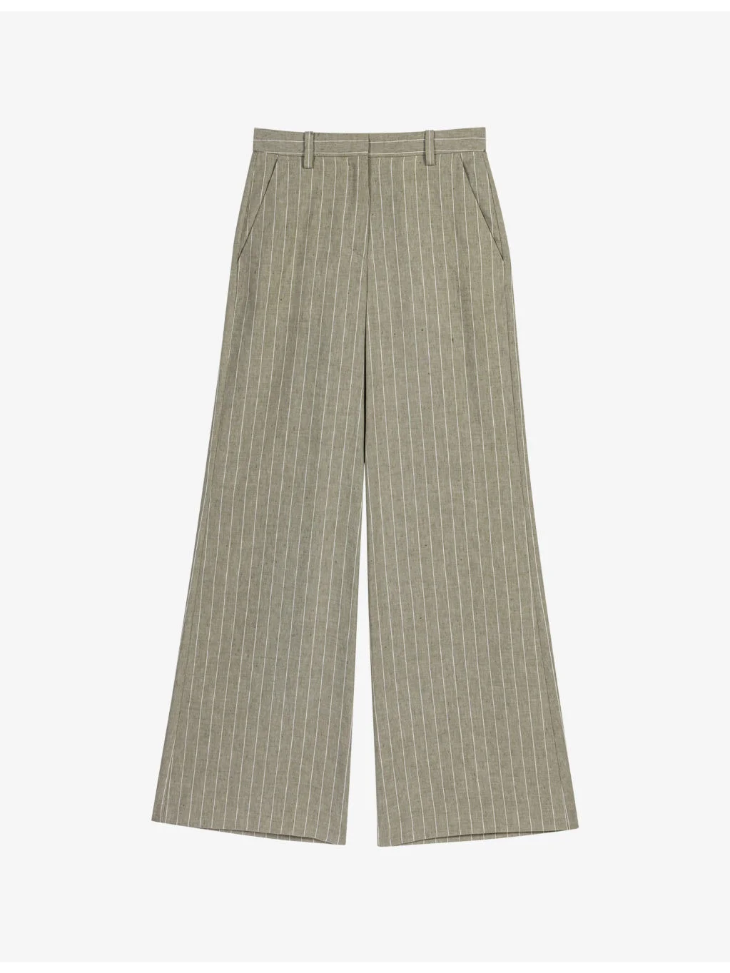 PRODUCT DETAILS - Maje cotton and linen-blend trousers - 52% linen, 47% cotton, 1% viscose - Button, hook-and-eye and zip-fly fastening - Regular fit, high rise, two Italian pockets, stripe pattern, wide leg - Dry clean - True to size - Model is 5ft 9in/1.75m and wears a size UK 8 - Midweight, non-stretch Ref: R04606221