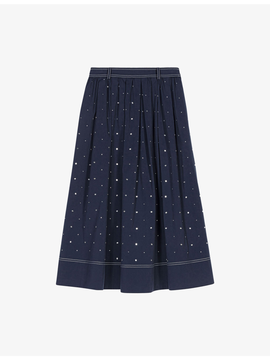 PRODUCT DETAILS - Maje stretch cotton-blend midi skirt - 69% cotton, 28% polyamide, 3% elastane; pocket lining 100% cotton - High waist, elasticated back waistband, belt loops, all-over metal stud embellishments, two side pockets, contrast stitching to waist and hem, midi length - Hand wash - True to size - Model is 5ft 10in/1.78m and wears a size UK 8 - Midweight, slight stretch Ref: R04495409