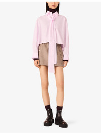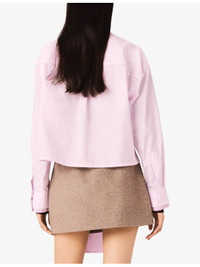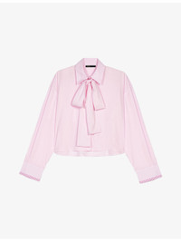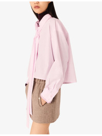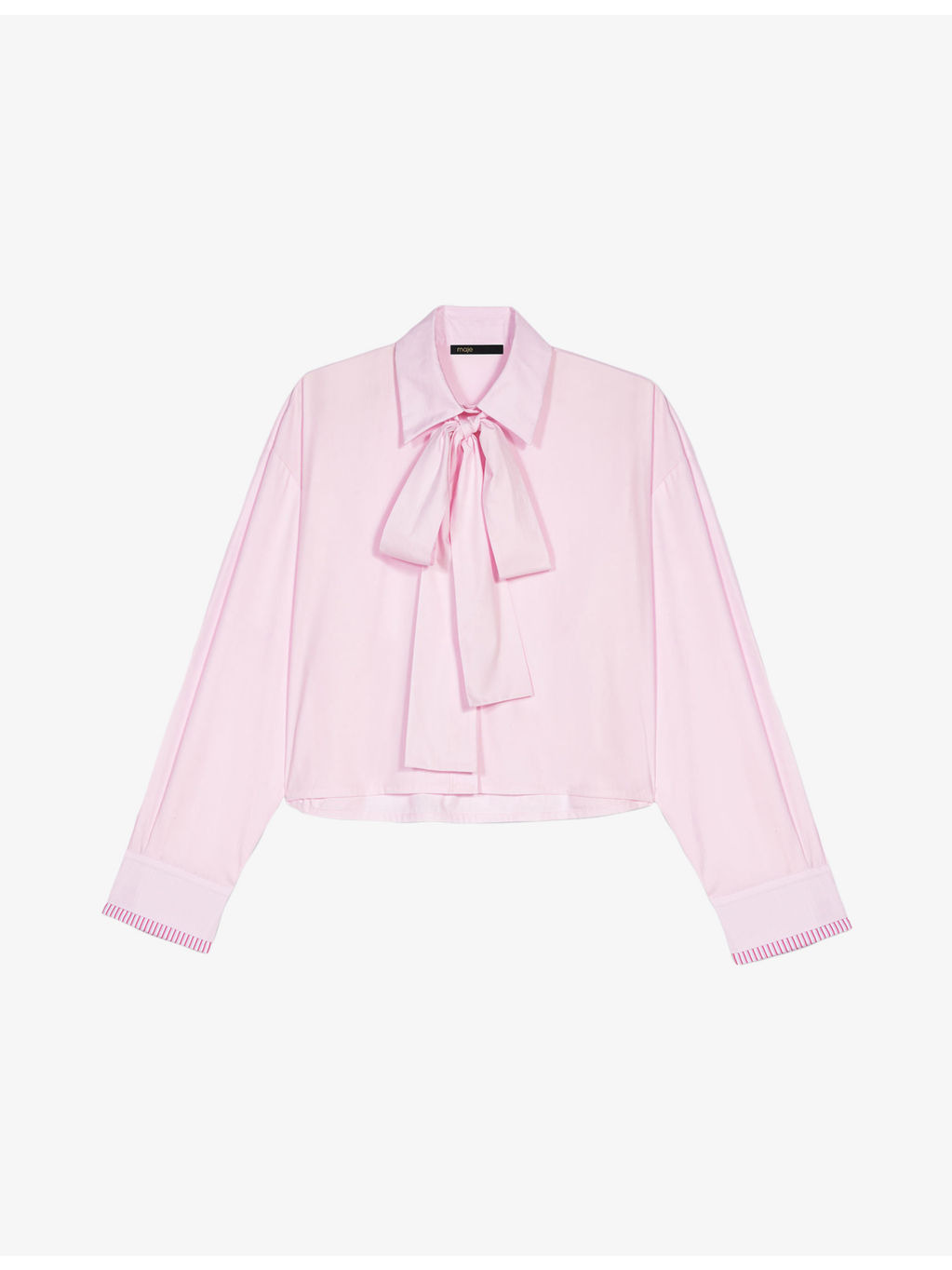 PRODUCT DETAILS - Maje cotton shirt - 100% cotton - Exposed button fastening at front - Regular fit, pussy-bow neckline, long sleeves, short length - Machine wash at 30°C - Model is 5ft 11in/1.80m and wears a size UK 8 - Lightweight, non-stretch Ref: R04514857