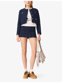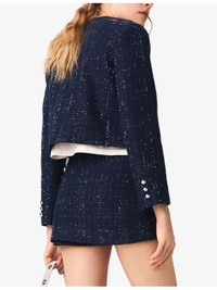 PRODUCT DETAILS - Maje cotton-blend jacket - 44% cotton 25% polyester 23% viscose 7% polyamide 1% other fibres; lining 100% viscose - Exposed button fastening at front - Regular fit, collarless, long sleeves, four buttoned flap pockets, tweed texture, sequin embellishments, buttoned cuffs, cropped length, metal buttons - Dry clean only - True to size - Model is 5ft 10in/1.78m and wears a size UK 8 - Midweight, non-stretch Ref: R04598249