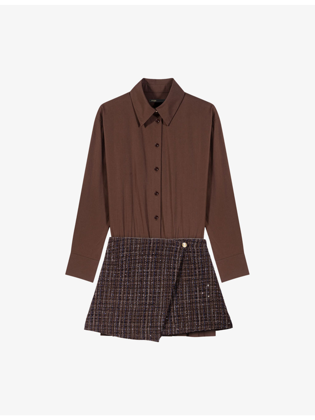PRODUCT DETAILS - Maje cotton dress - 100% cotton - Exposed button fastening at front - Two-in-one design, cotton collared shirt, long sleeves, buttoned cuffs, tweed mini skirt - Dry clean - True to size - Model is 5ft 10in/1.78m and wears a size UK 8 - Midweight, non-stretch Ref: R04533238