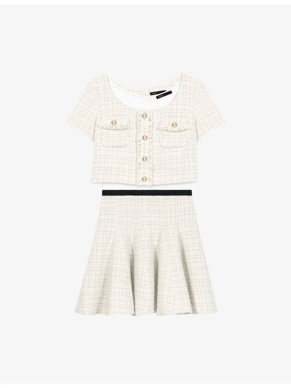 PRODUCT DETAILS - Maje tweed mini dress - 69% cotton, 19% polyester, 5% polyamide, 3% acrylic, 2% viscose, 1% metallised fibres, 1% other fibres - Dress: concealed zip fastening, rib-knit top, scoop neck, sleeveless, contrast waistband, flared tweed skirt - Top: exposed button fastening at back, regular fit, scoop neck, short sleeves, tweed texture, mock buttoned pockets and placket at front, open back - Dry clean only - True to size - Model is 5ft 10in/1.78m and wears a size UK 8 - Midweight, non-stretch Ref: R04598257