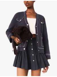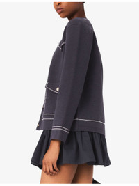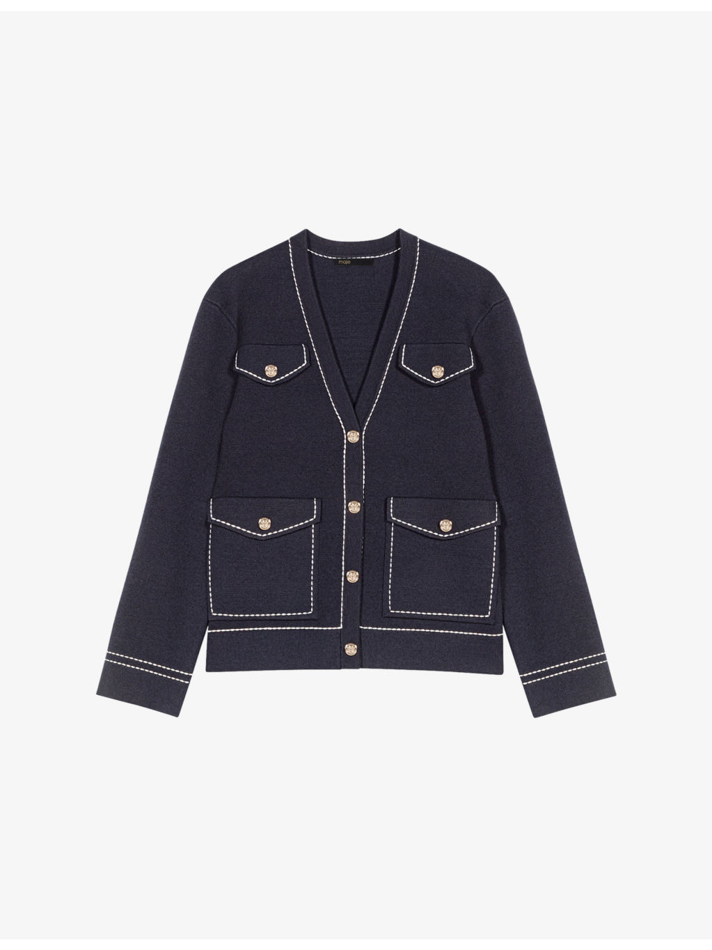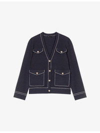 PRODUCT DETAILS - Maje knitted cardigan - 44% cotton, 27% acrylic, 17% wool, 10% polyamide, 2% elastane - Button fastening - Regular fit, V-neck, long sleeves, chest pockets, side pockets, contrast stitching - Hand wash - True to size - Model is 5ft 10in/1.78m and wears a size UK 8 - Midweight, slight stretch Ref: R04509741