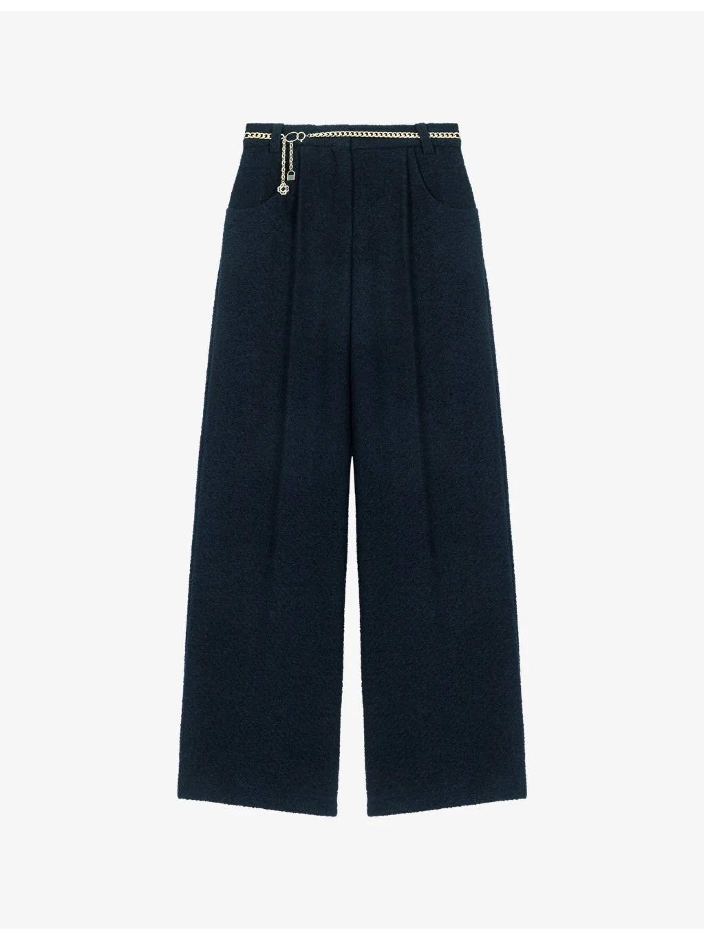 PRODUCT DETAILS - Maje tweed trousers - 53% polyester, 28% cotton, 18% viscose, 1% elastane - Button and zip-fly fastening - Regular fit, mid-rise, wide leg, belt loops, branded chain belt, side pockets, back pockets, centre creases - Dry clean - True to size - Midweight, non-stretch Ref: R04598659