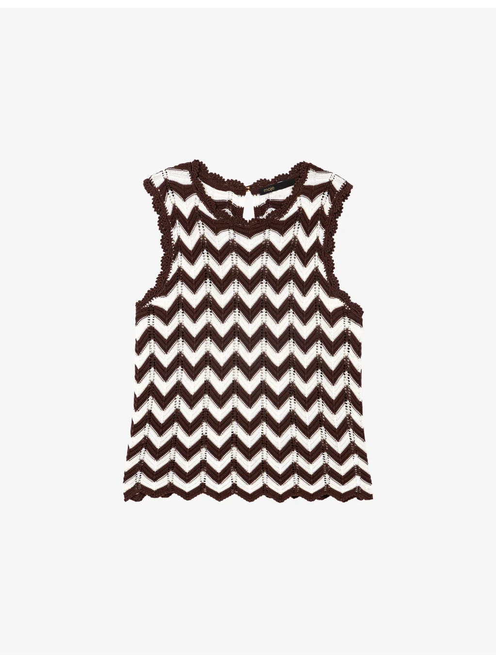 PRODUCT DETAILS - Maje cotton-crochet top - 100% cotton - Button fastening - Regular fit, round-neck, sleeveless, scalloped hem, all-over zig-zag pattern - Hand wash - True to size - Model is 5ft 10in/1.78m and wears a size UK 8 - Lightweight, slight stretch Ref: R04612463