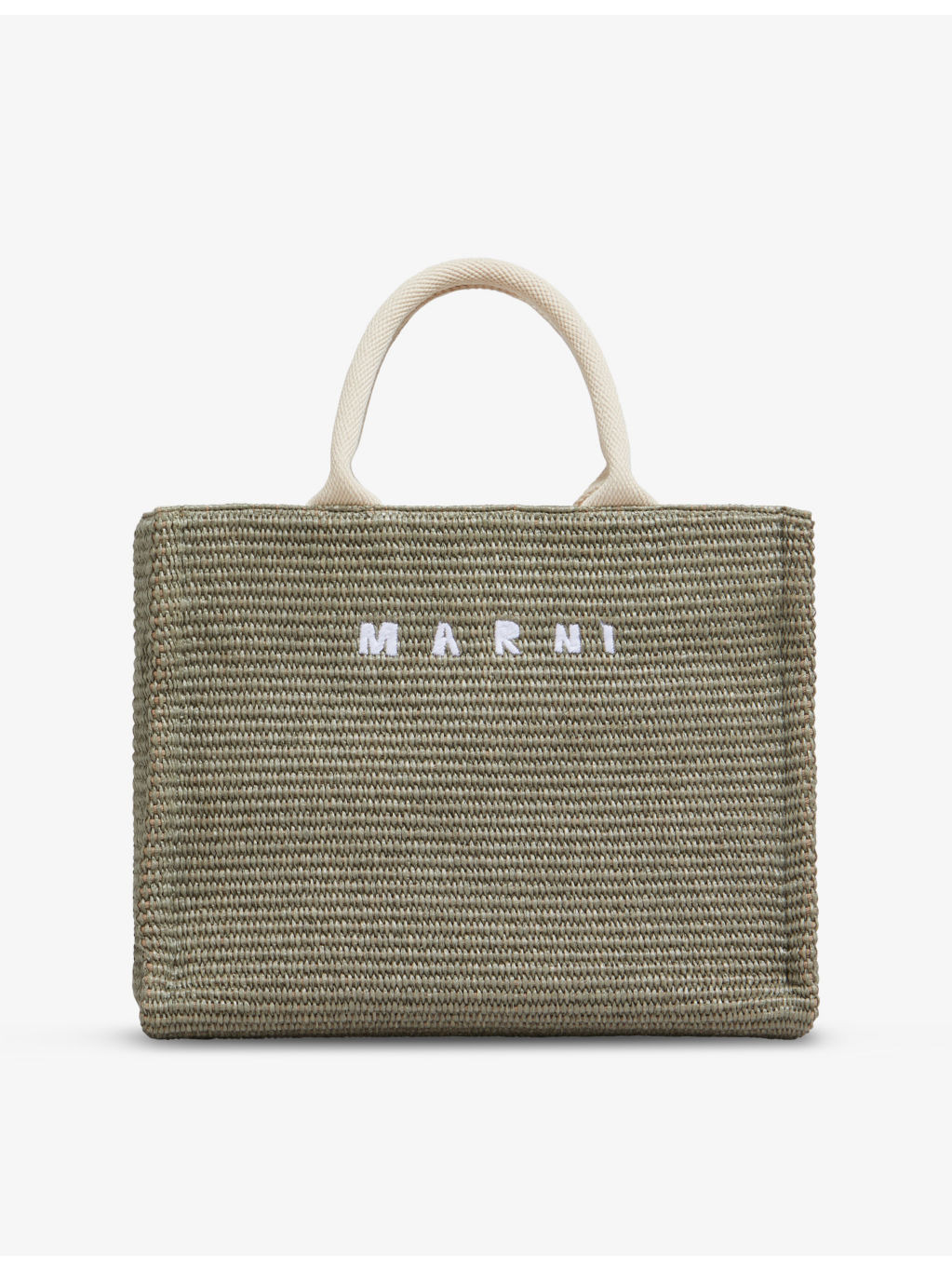 PRODUCT DETAILS - Marni cotton-blend tote bag - 52% cotton, 48% polyamide - Open top with pressed stud closure - Structured shape, double top handles, shoulder strap, brand text embroidery at front, one main compartment, internal zip pocket, raffia-effect design - Height 24cm, width 32cm, depth 14cm - Wipe with a clean, dry cloth Ref: R04415360